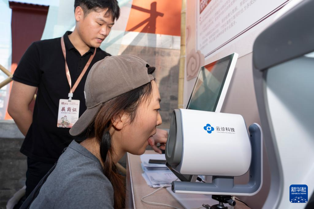 9月19日,市民在安徽中醫藥大學展臺的智慧中醫體驗區查看舌苔。