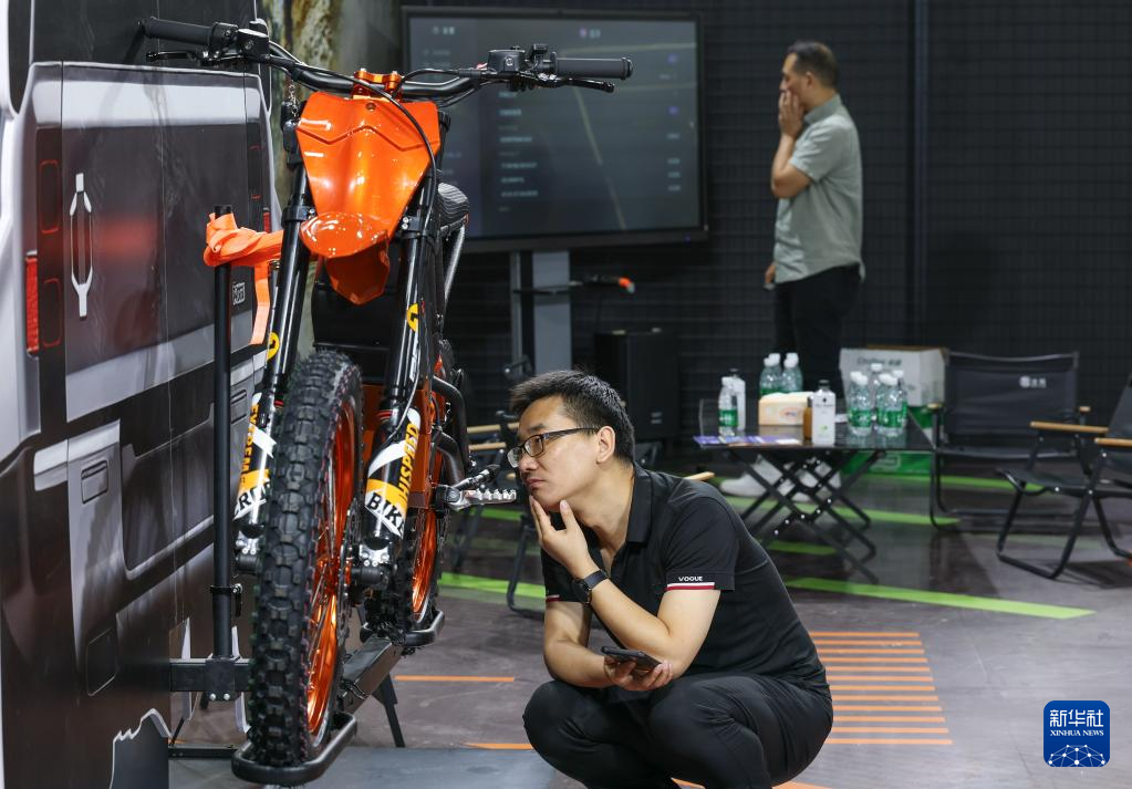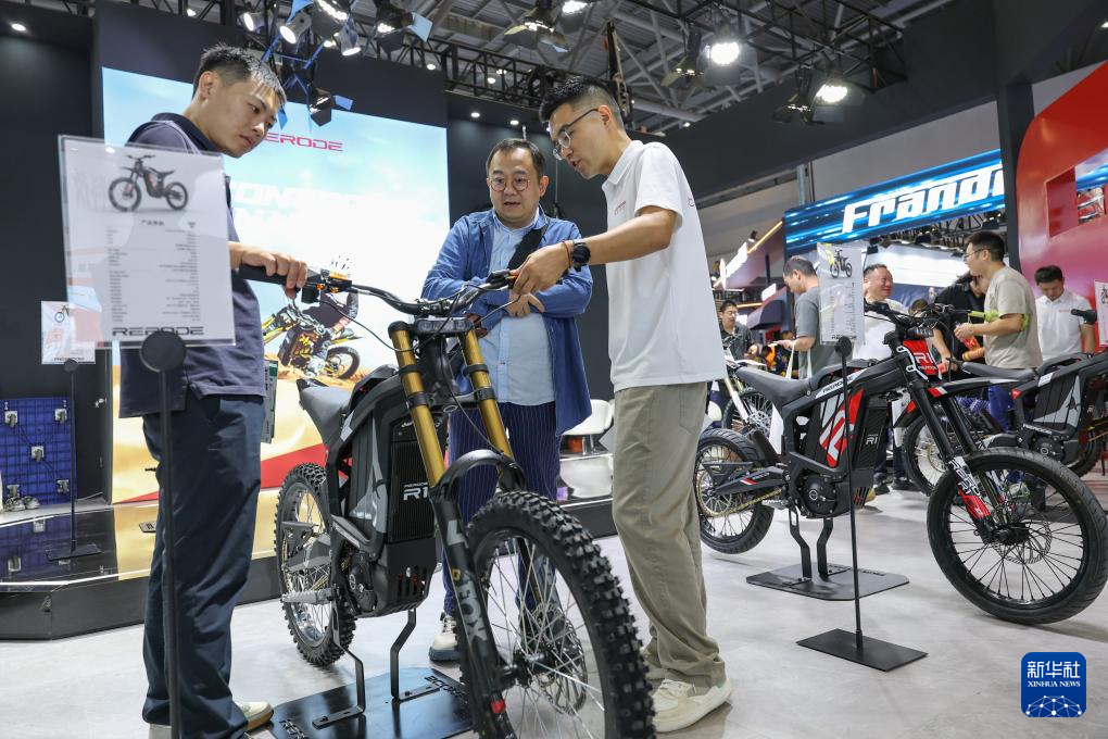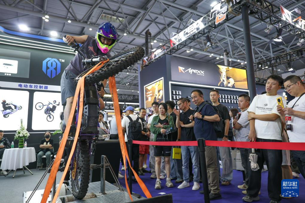 9月19日,觀眾在摩博會現場體驗國產新能源摩托車控制器自動翹頭功能。