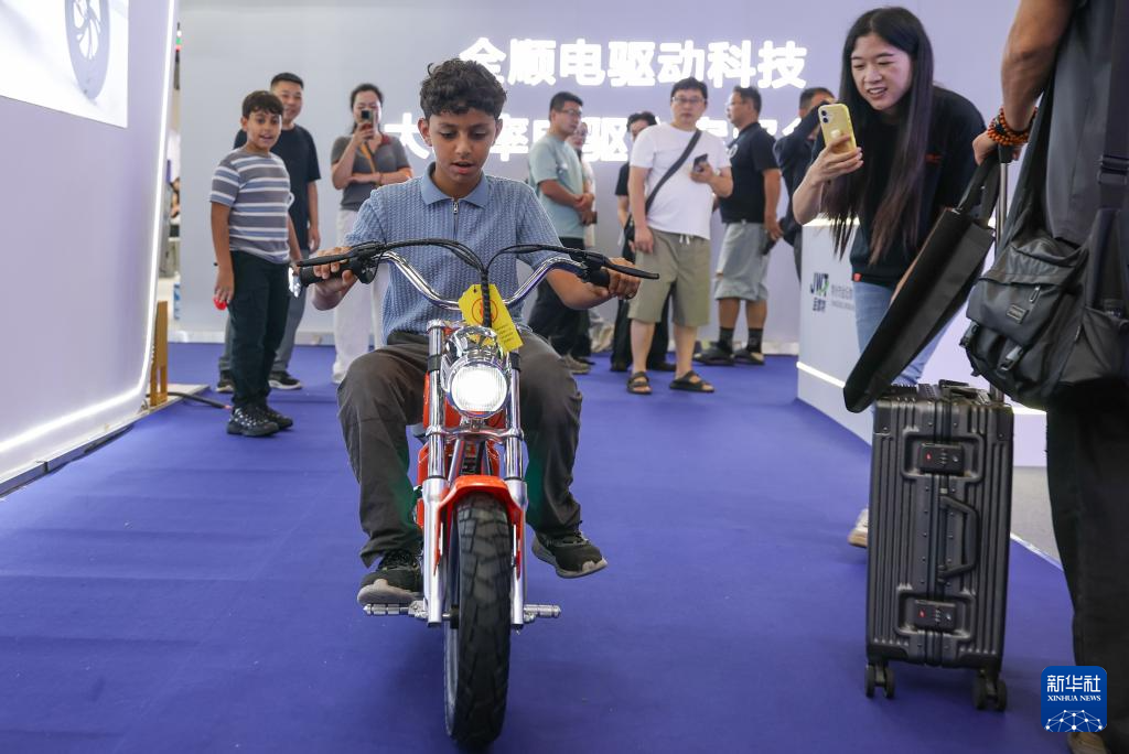 9月19日,小朋友在摩博會現場體驗新能源摩托車。