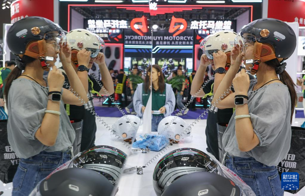 9月19日,觀眾在摩博會現場試戴摩托車頭盔。