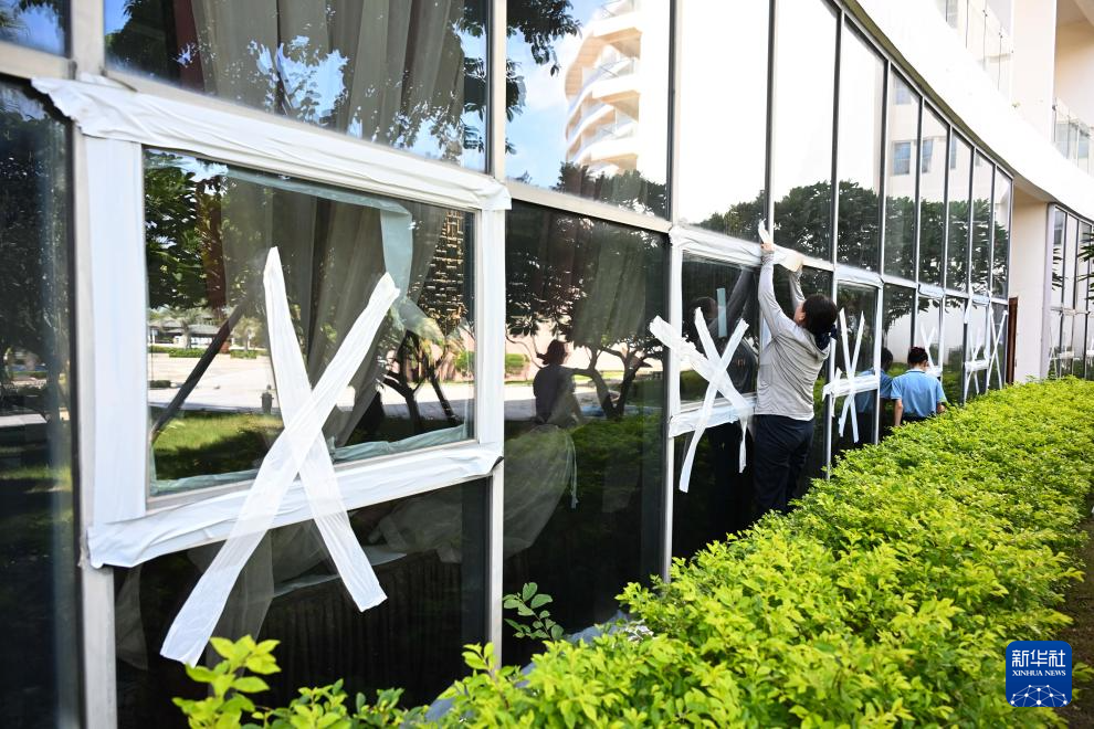 9月23日,在廣東陽江市海陵島的海韻戴斯酒店,工作人員在給玻璃門貼上膠帶。