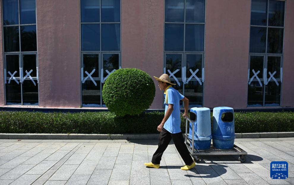 9月23日,在廣東陽江市海陵島一酒店,工作人員提前轉移海邊的垃圾桶。