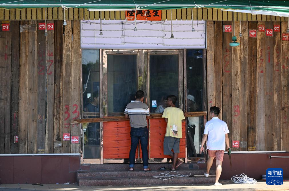 9月23日,在廣東陽江市海陵島的一處飯店,工作人員在安裝防風木板。
