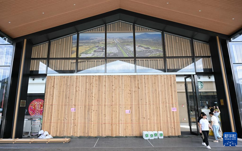 9月23日,在廣東江門市的沈海高速梁金山服務區,落地玻璃大門外已經安裝了防風木板。