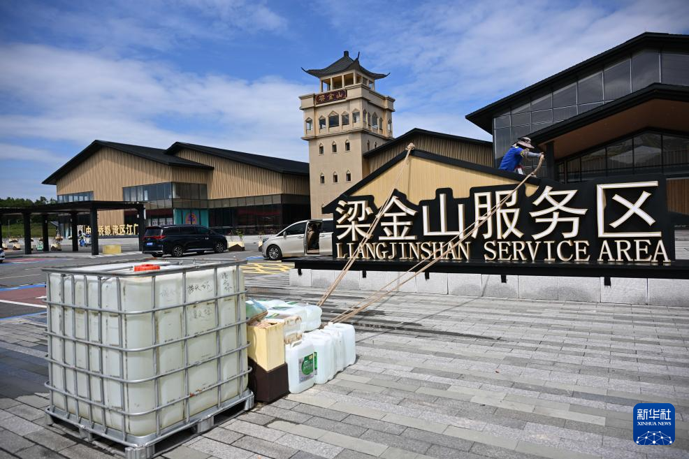 9月23日,在廣東江門市的沈海高速梁金山服務區,工作人員在加固設施。