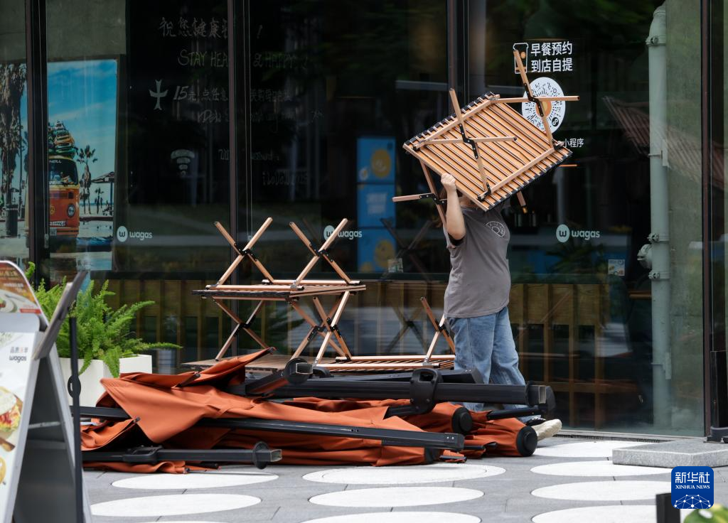 9月23日,在深圳市福田區一處商場,臨街餐館的服務員收拾室外桌椅設施。