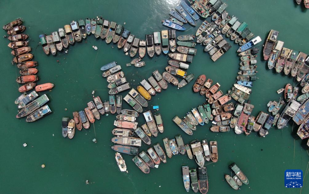 9月23日,在廣東陽江市海陵島閘坡國家中心漁港停滿了歸港避風的漁船(無人機照片)。