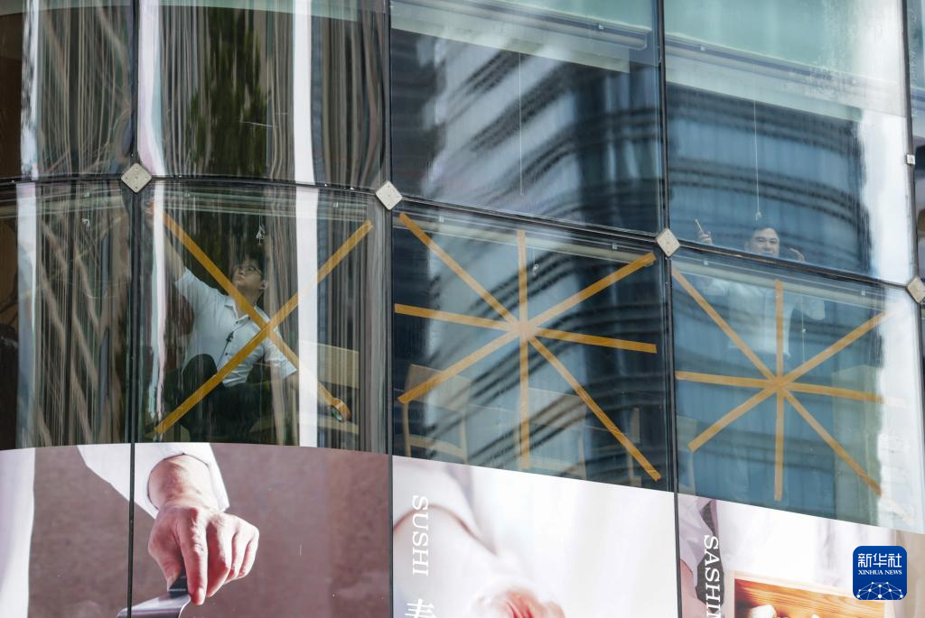 9月23日,在深圳市福田區一處商場,工作人員為窗戶貼上膠帶防范臺風。