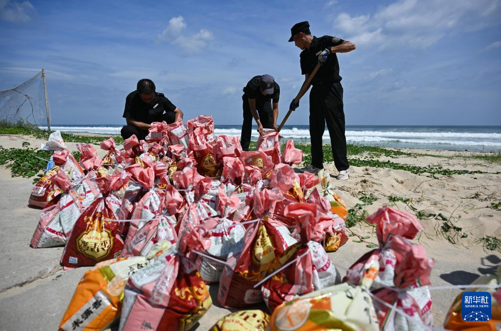 9月23日,在廣東陽江市海陵島十里銀灘,酒店工作人員在填裝沙袋。