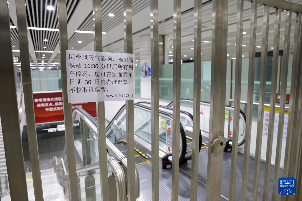 9月23日,深圳福田高鐵站的進站閘門已關閉,門口張貼著因臺風停運的告示。