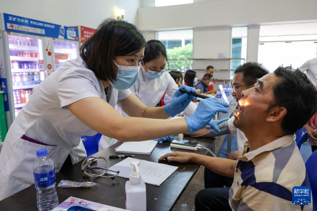 9月23日,在深圳大學粵海校區羽毛球館,社區醫務人員為避險群眾進行身體檢查。