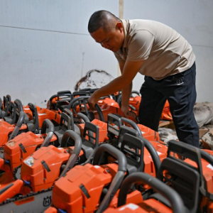9月23日,??谑泄簿G化管理所的工作人員在保養手提鋸。