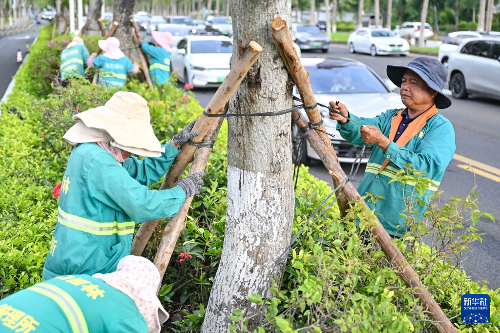 9月23日,??谑泄簿G化管理所的工作人員在加固樹木。
