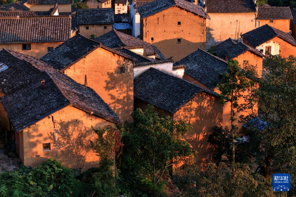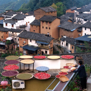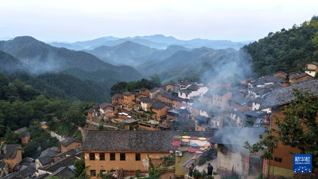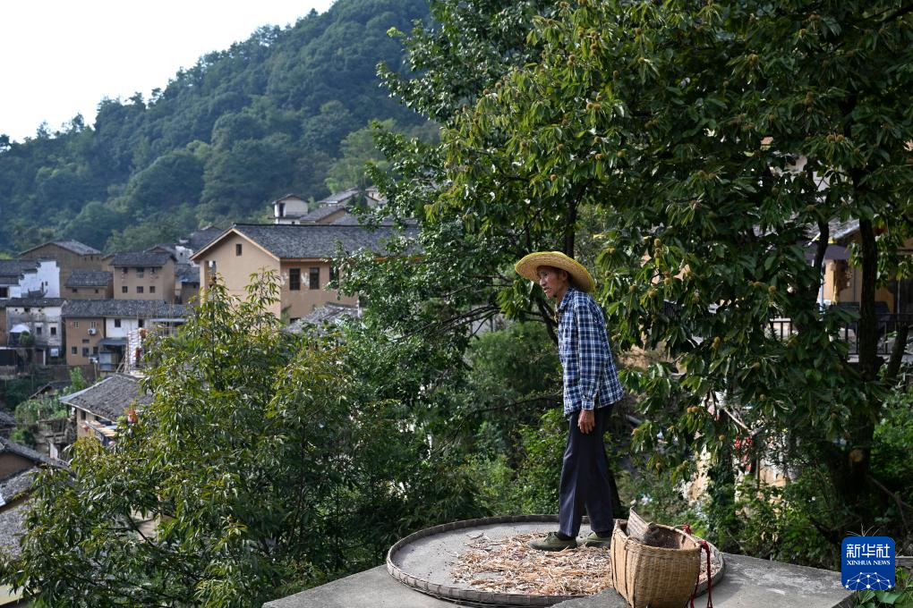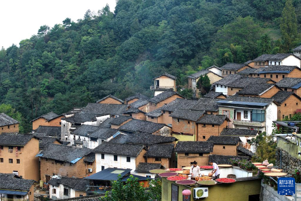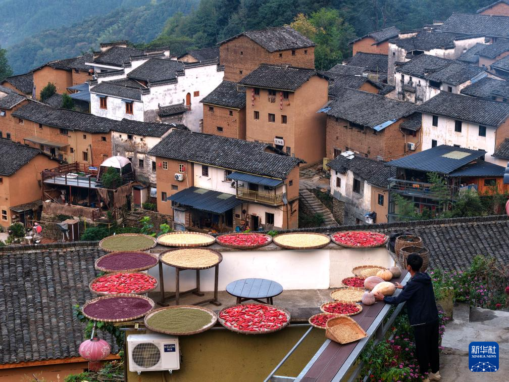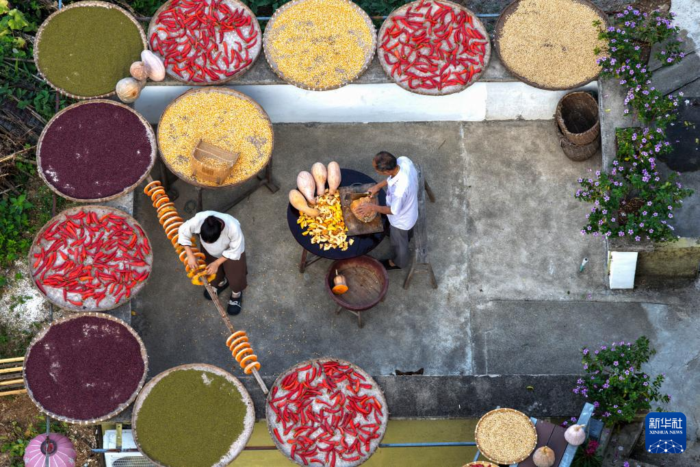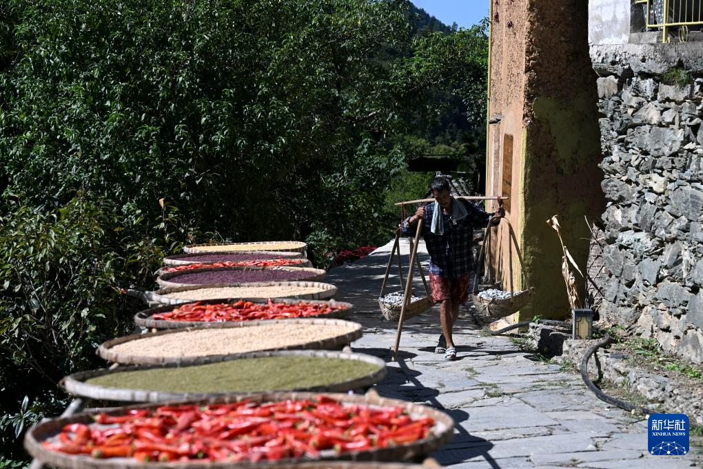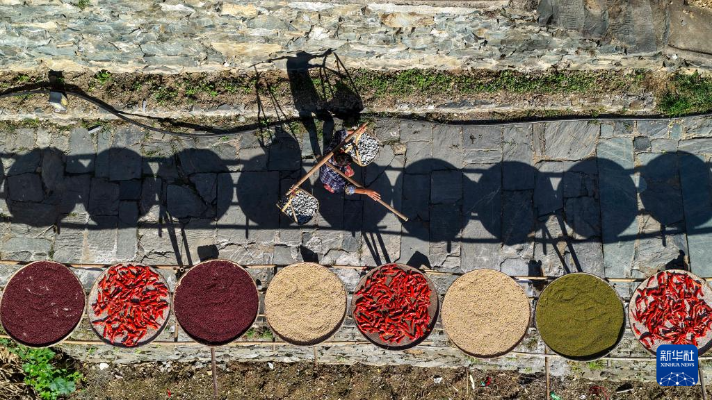 時值秋收時節,村民們利用晴好天氣,將辣椒、玉米、山核桃等農作物晾曬在房前屋后,形成獨具特色的“曬秋”景觀。