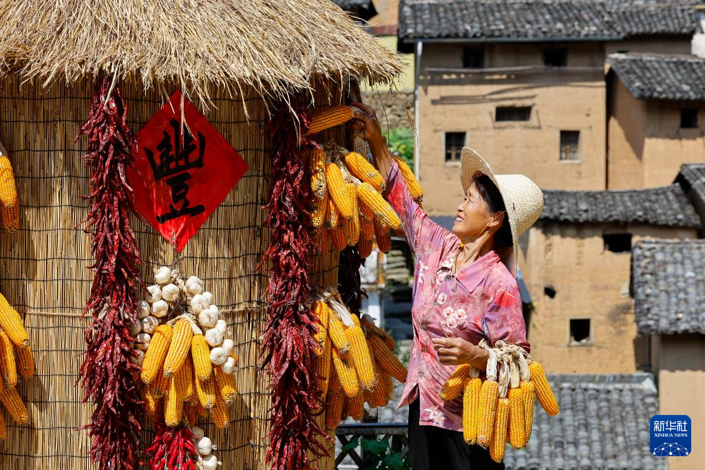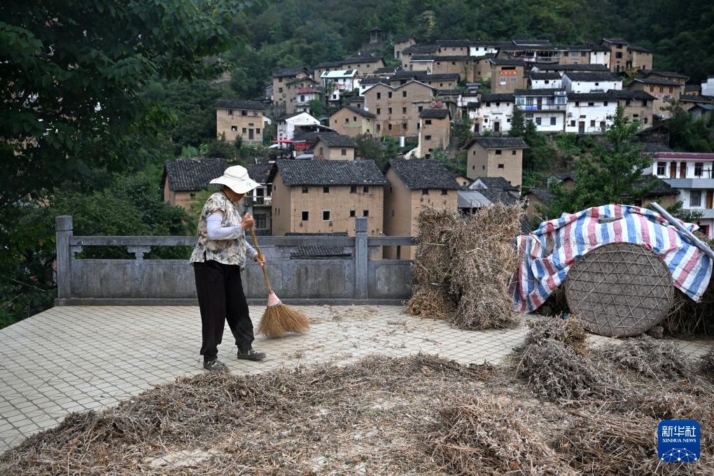 9月17日,陽產村村民在土樓前晾曬農作物。