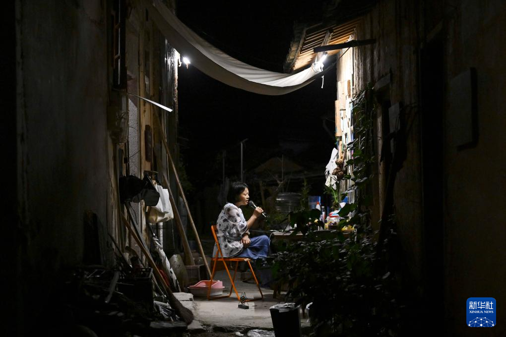 9月18日,陽產村村民吃完晚飯后對著手機唱歌休息。