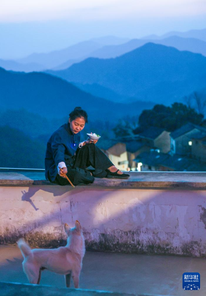 陽產村村民吃晚飯時與小狗互動(2023年11月29日攝)。
