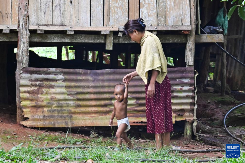 9月4日,在馬來西亞彭亨州珍尼湖生物圈保護區丹戎普特村,一名賈昆女子牽著孩子。