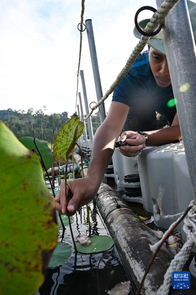 9月3日,在馬來西亞彭亨州珍尼湖生物圈保護區,保護區研究員依冠照料他培育的荷花。
