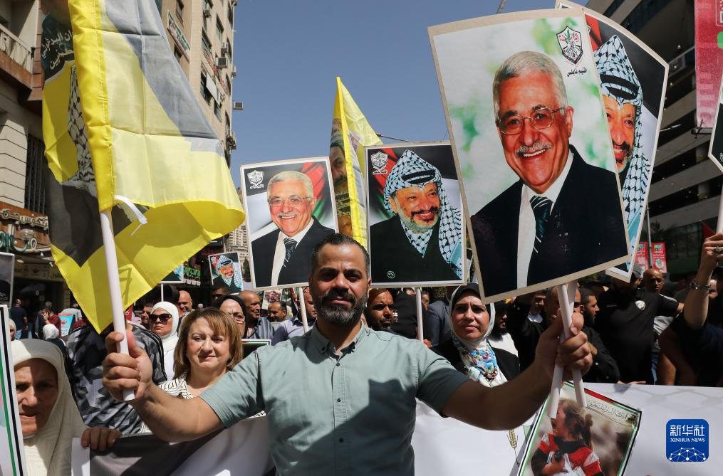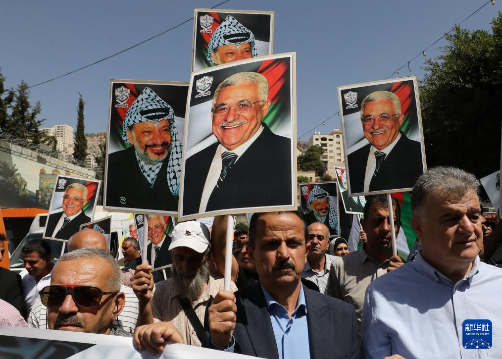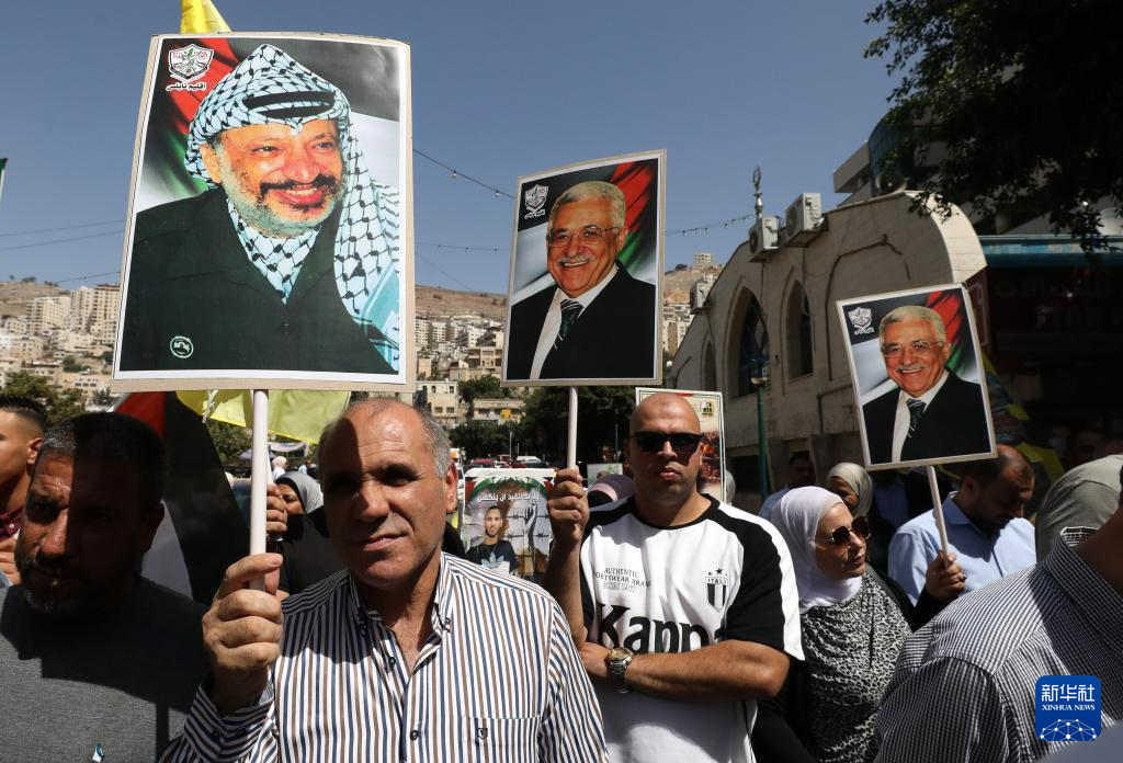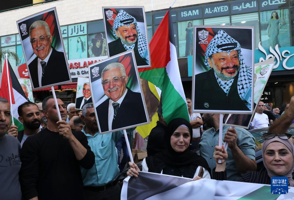 9月23日,在約旦河西岸城市納布盧斯,民眾揮舞巴勒斯坦領導人阿拉法特和阿巴斯畫像參加慶?;顒?。
