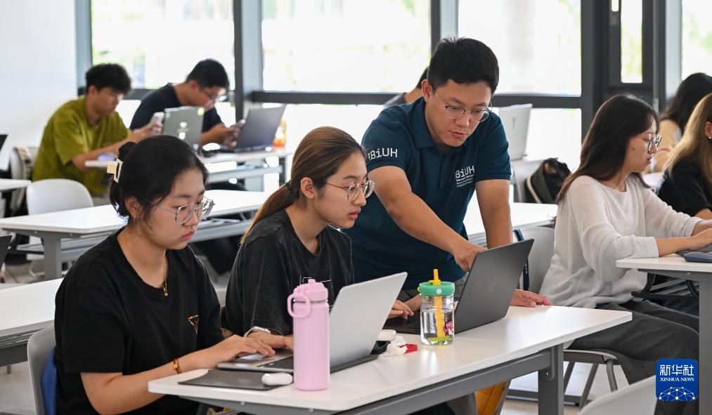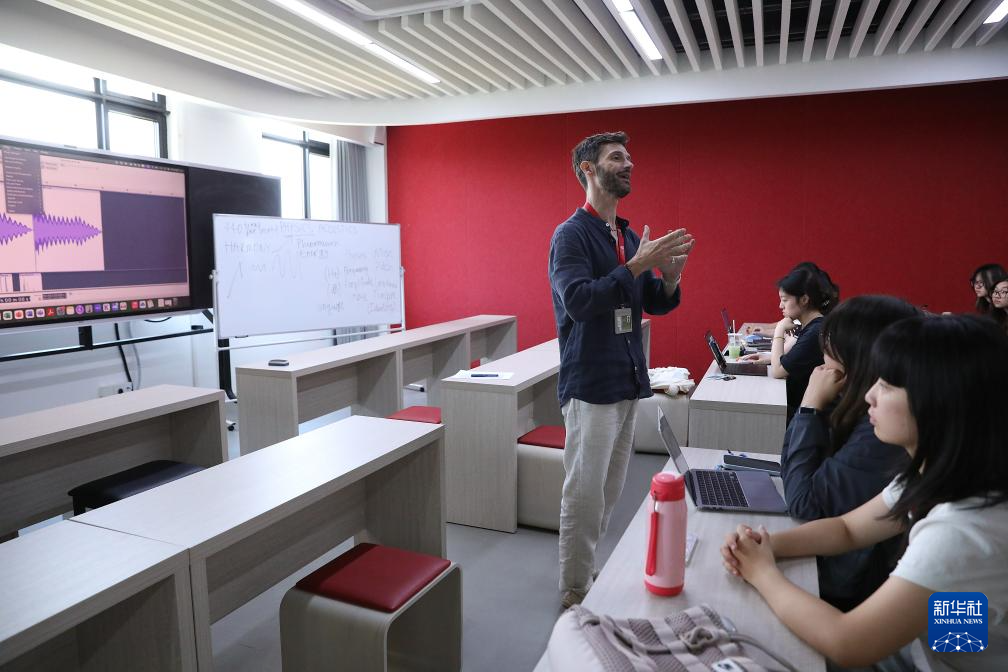 9月25日,中央民族大學海南國際學院的外籍教師在給學生上音樂技術與作曲課。