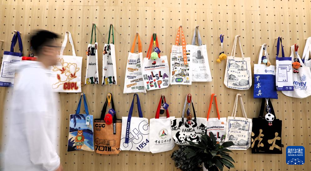 9月25日,在海南陵水黎安國際教育創新試驗區的文創商店內,一名顧客走過掛滿該教育試驗區入駐學校標識的文創帆布袋。