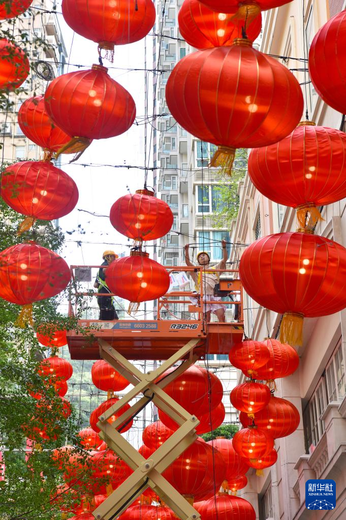 9月28日,工作人員在香港利東街懸掛大紅燈籠。