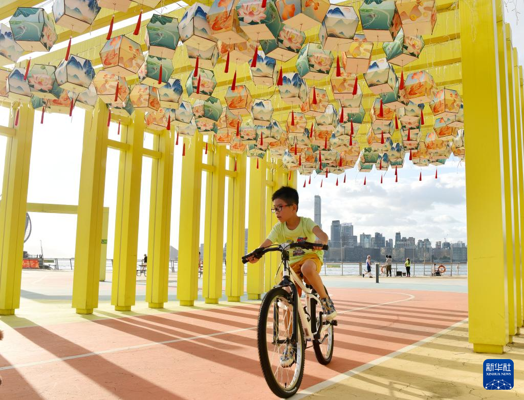 9月27日,在香港東岸公園,一名男孩騎車從中秋彩燈下經過。