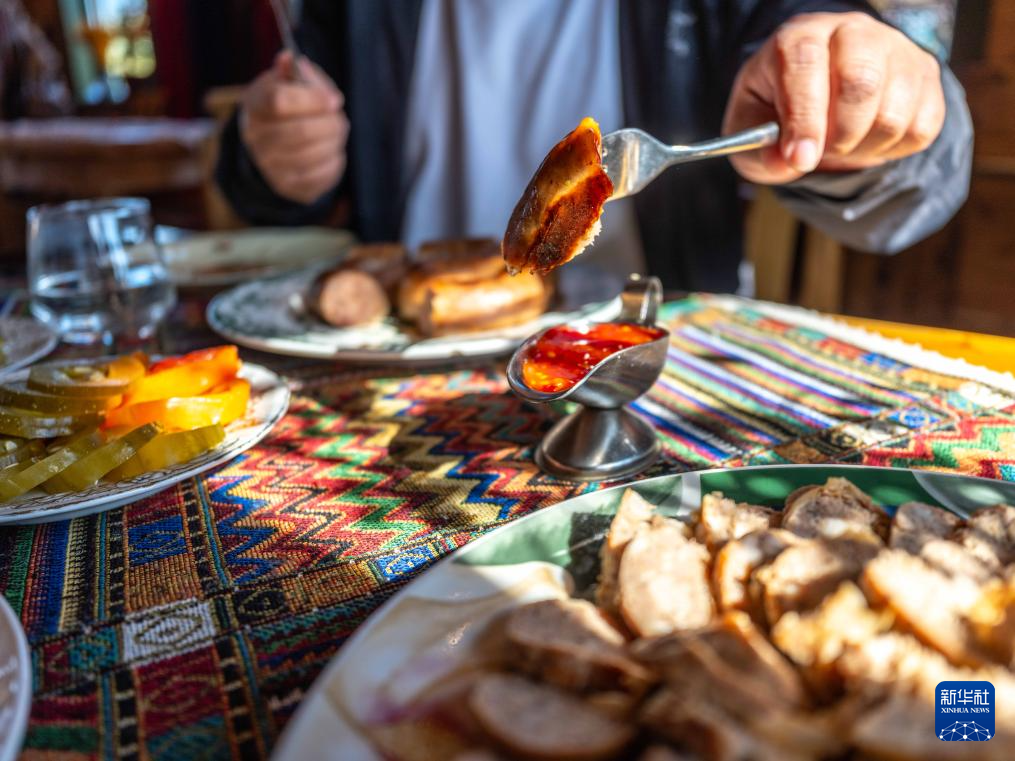 9月18日,在內蒙古呼倫貝爾市額爾古納市恩和俄羅斯族民族鄉恩和村,游客享用俄羅斯族傳統美食。
