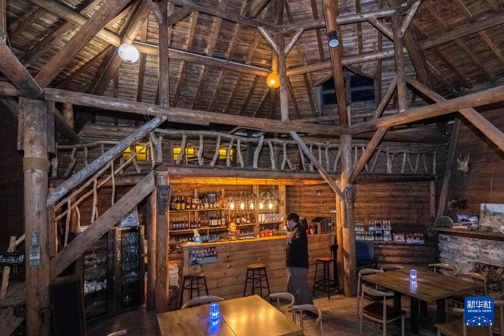 這是9月17日在內蒙古呼倫貝爾市額爾古納市恩和俄羅斯族民族鄉恩和村拍攝的木刻楞酒吧的內景。