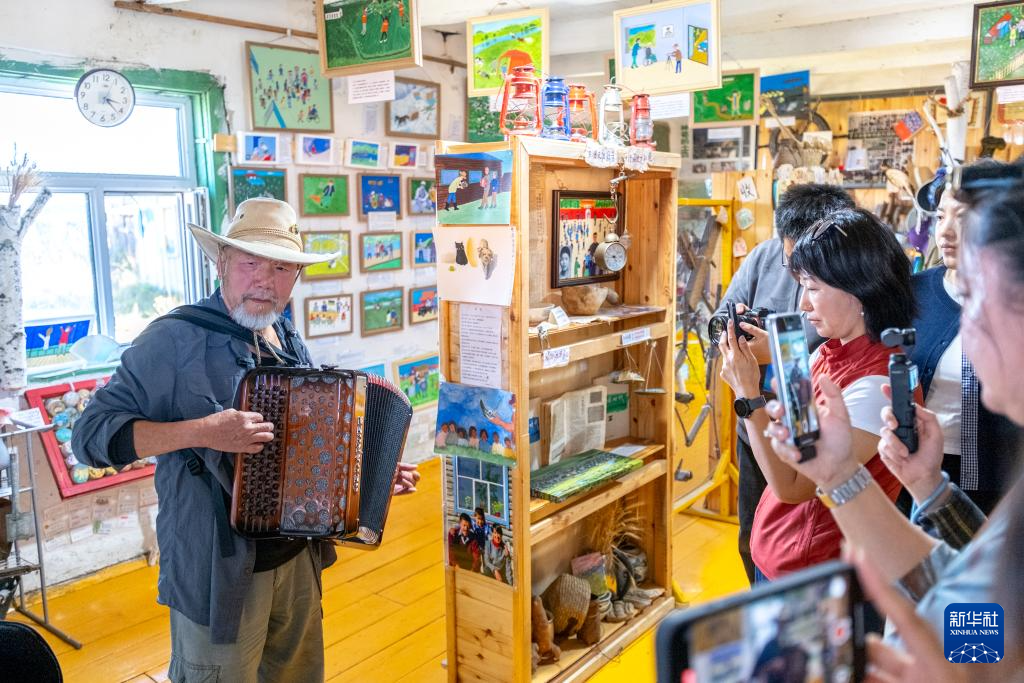 9月26日,在內蒙古呼倫貝爾市額爾古納市恩和俄羅斯族民族鄉恩和村,黃老頭為游客們演奏手風琴。黃老頭本名黃焱紅,曾是一名旅游記者,退休后開了“黃老頭博物館”,宣介當地文化。