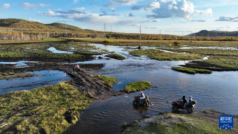 9月17日,在內蒙古呼倫貝爾市額爾古納市恩和俄羅斯族民族鄉恩和村,游客駕駛越野摩托游玩(無人機照片)。