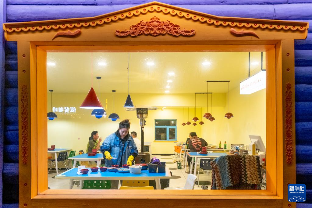 9月25日,在內蒙古呼倫貝爾市額爾古納市恩和俄羅斯族民族鄉恩和村,人們在一家木刻楞風格的餐館進餐。