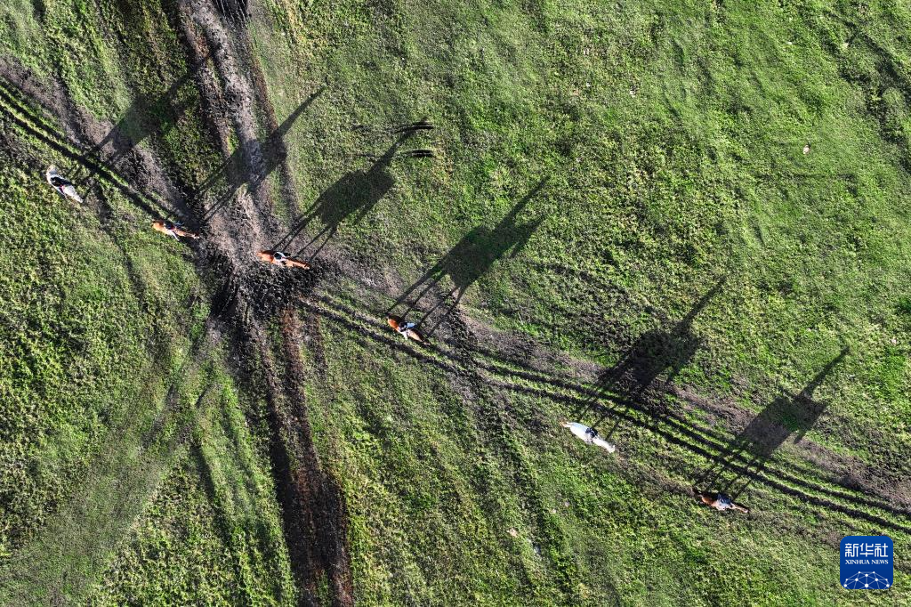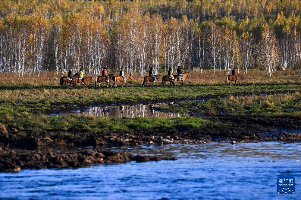 9月17日,在內蒙古呼倫貝爾市額爾古納市恩和俄羅斯族民族鄉恩和村,游客在騎馬(無人機照片)。
