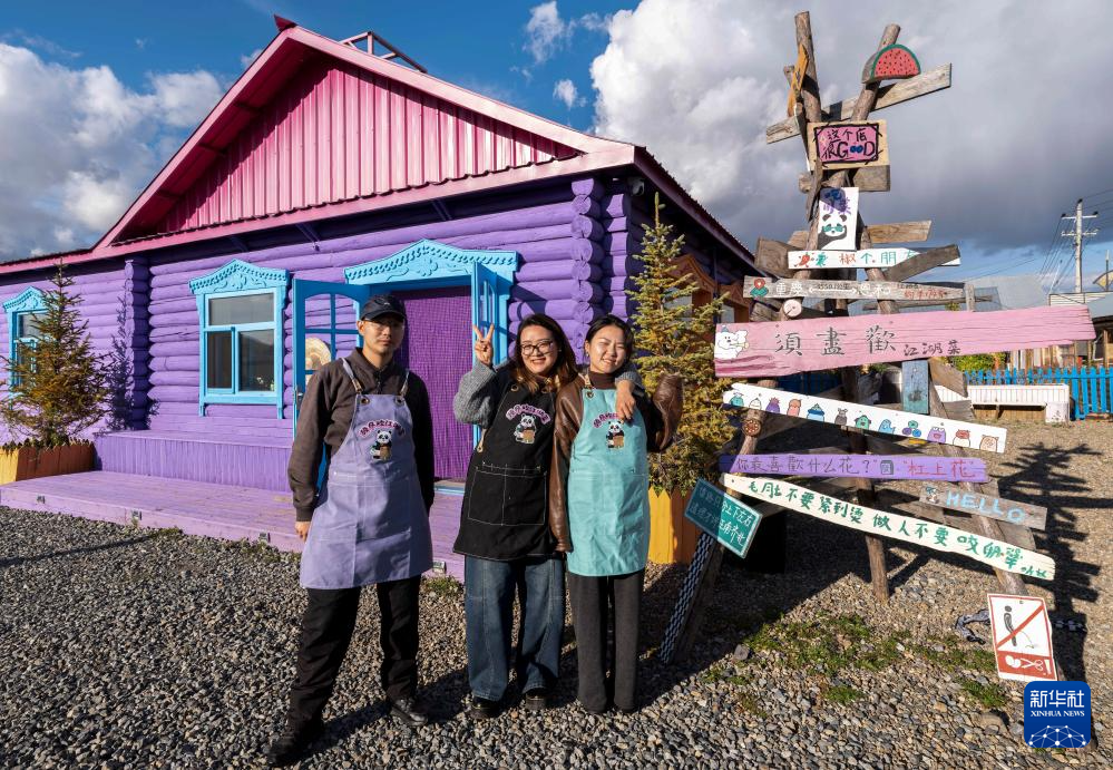 9月17日,在內蒙古呼倫貝爾市額爾古納市恩和俄羅斯族民族鄉恩和村,來自重慶的年輕人在他們開的川菜館前合影。
