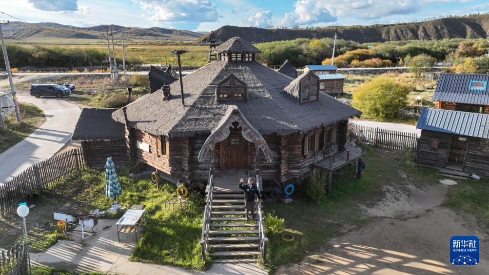 9月17日在內蒙古呼倫貝爾市額爾古納市恩和俄羅斯族民族鄉恩和村拍攝的一處木刻楞酒吧(無人機照片)。
