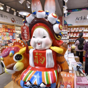 10月6日,游客在北京煙袋斜街的商店里選購北京兔兒爺文創產品。