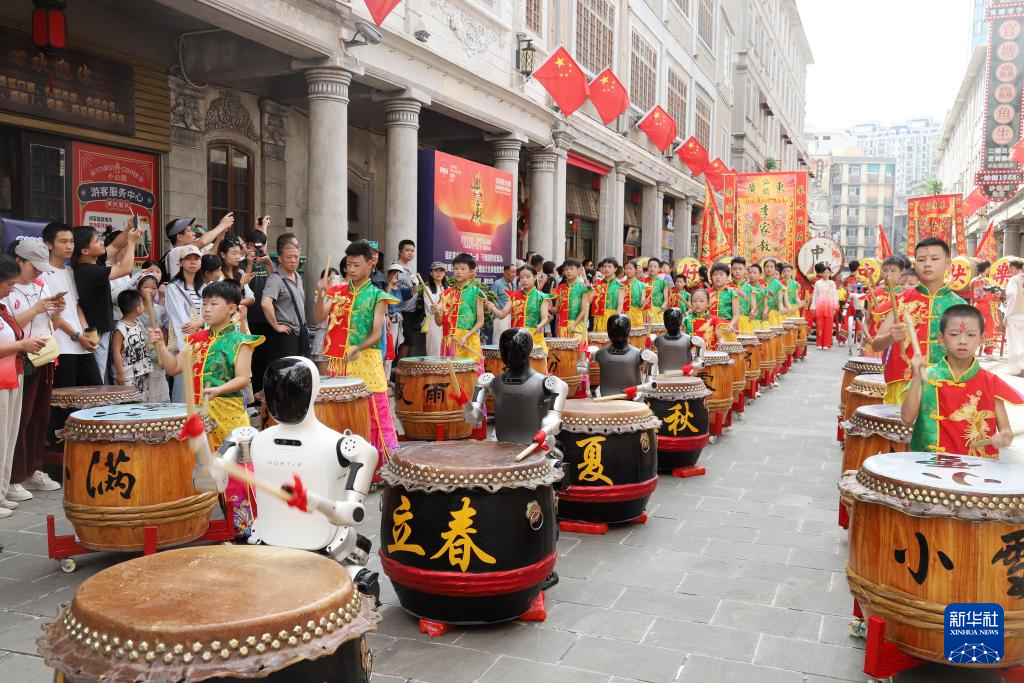 10月6日,在廣東省汕頭市小公園景區,機器人與演藝人員共同演出鼓舞《二十四節令鼓》。