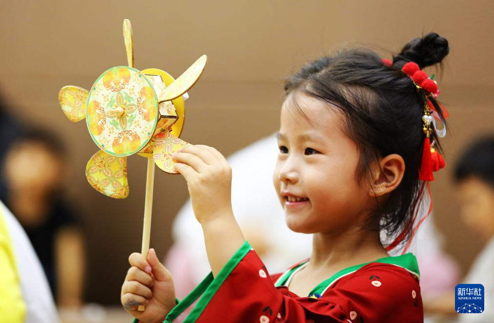 10月6日,在山東省滕州市博物館,小朋友制作“風車轉花燈”。