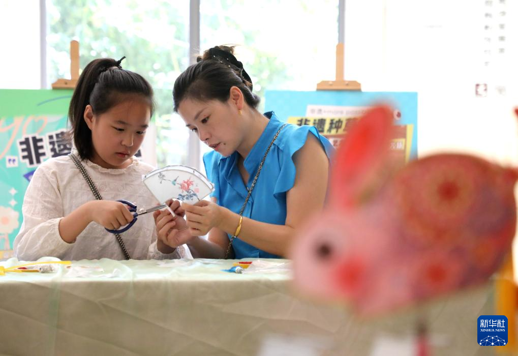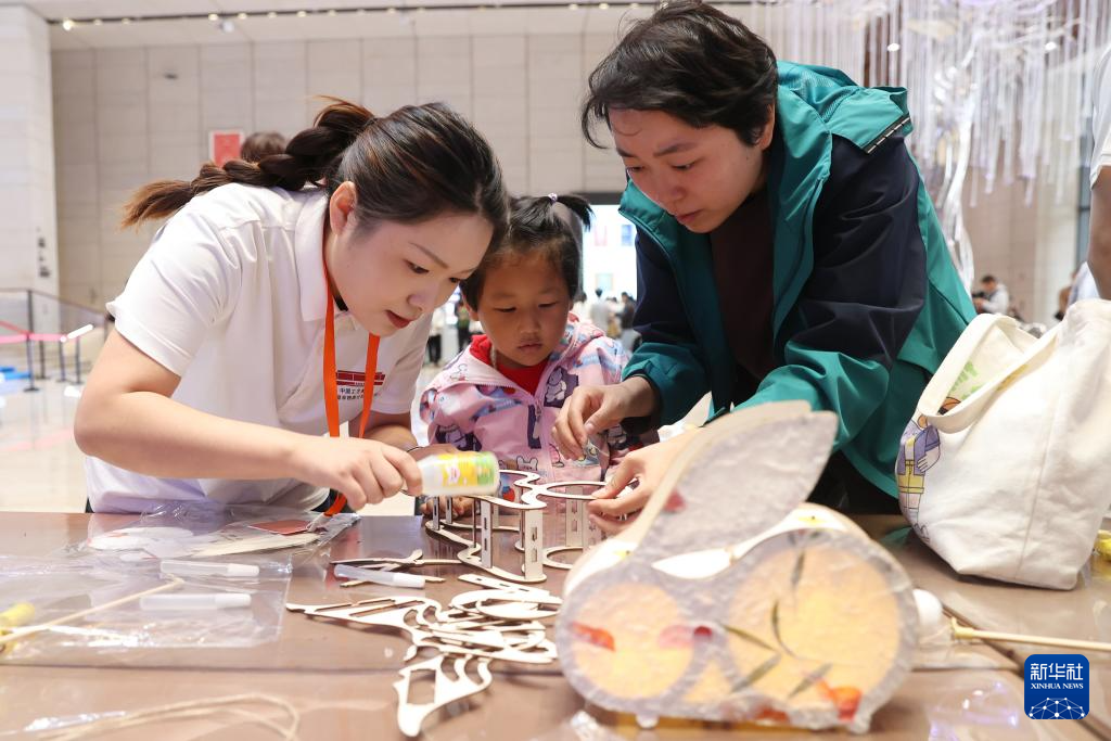10月6日,在位于北京的中國非物質文化遺產館設立的“中秋主題非遺手工藝體驗區”,工作人員(左一)指導家長與孩子制作月兔造型的花燈。