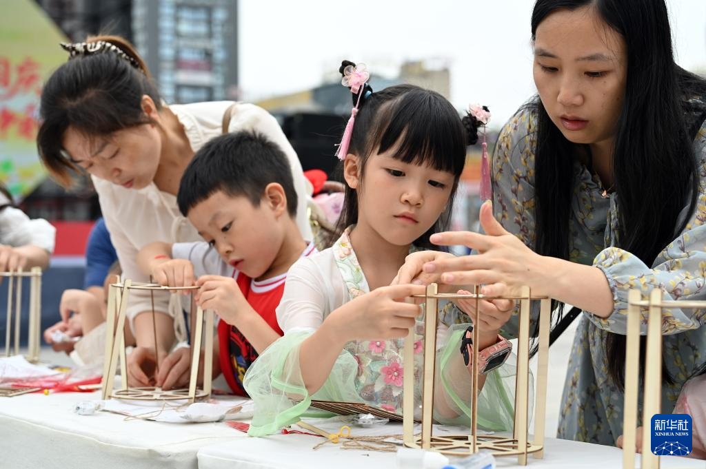 10月6日,在四川省內江市東興區西林街道,孩子們和家人一起制作中秋燈籠。