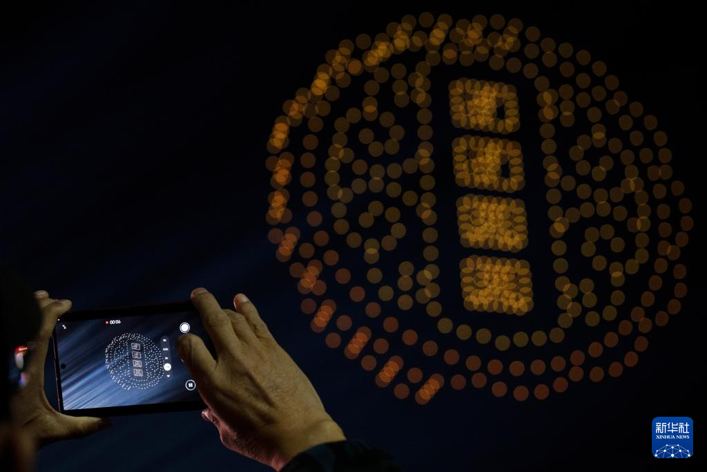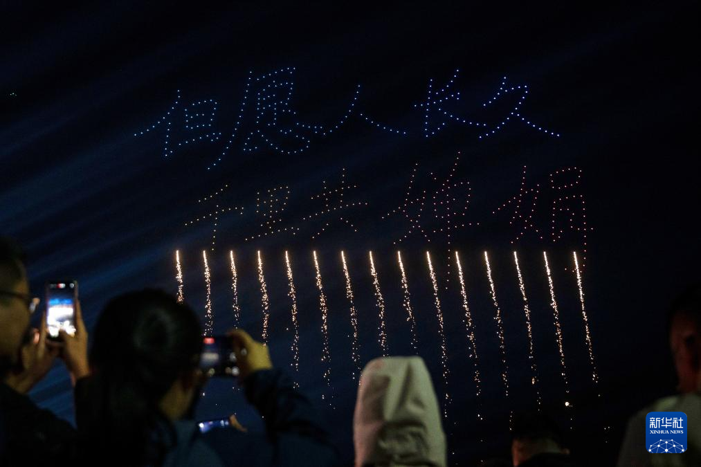 10月6日,人們在黑龍江哈爾濱冰雪大世界園區拍攝無人機表演。