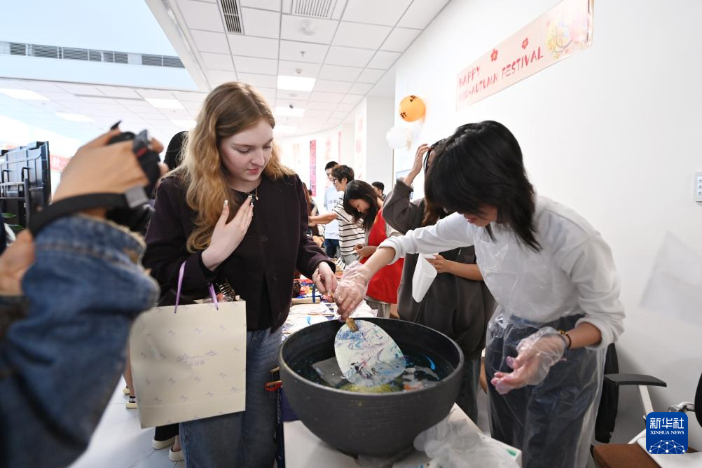 10月6日,在天津師范大學舉辦的“月圓中秋 情系中外——共赴文化奇妙夜”活動上,留學生體驗漂流漆技法。