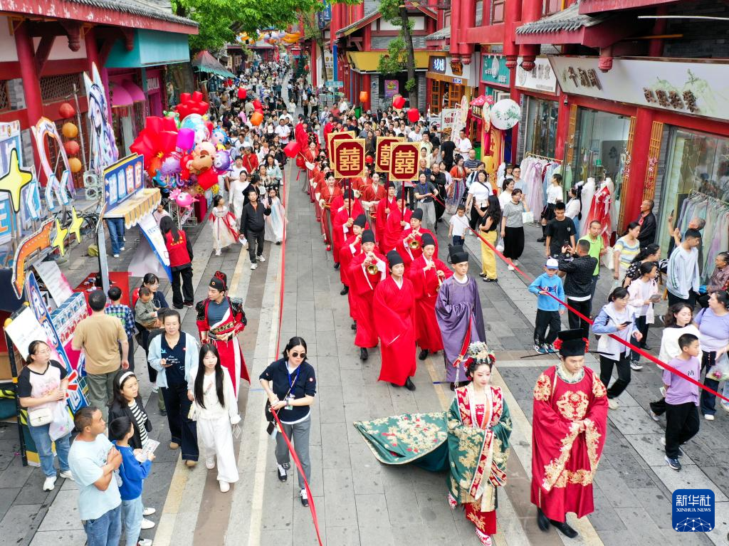 10月6日,在四川省眉山市東坡區無憂城,游人觀看傳統宋式婚禮表演(無人機照片)。