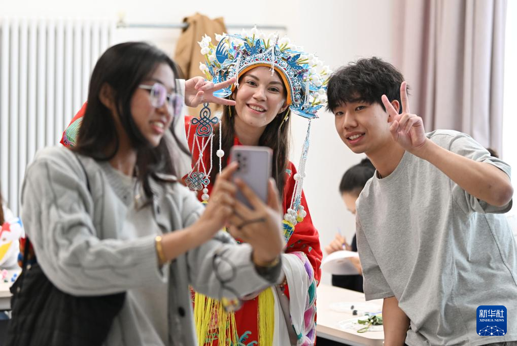 10月6日,在天津師范大學舉辦的“月圓中秋 情系中外——共赴文化奇妙夜”活動上,身著中國戲服的留學生和同學合影。