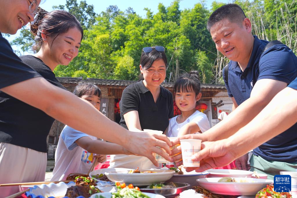 10月6日,在重慶市北碚區金刀峽鎮勝天湖村“九斗碗壩壩席”現場,游客舉杯共慶中秋佳節。
