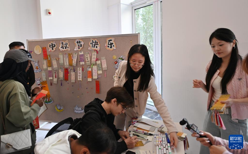 10月6日,在天津師范大學舉辦的“月圓中秋 情系中外——共赴文化奇妙夜”活動上,中外學生在祈愿卡上寫下祝福。
