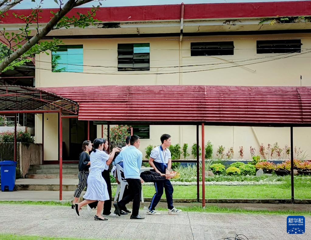 10月10日,在菲律賓南阿古桑省一所大學,地震中受傷人員被撤離至建筑物外并接受治療。