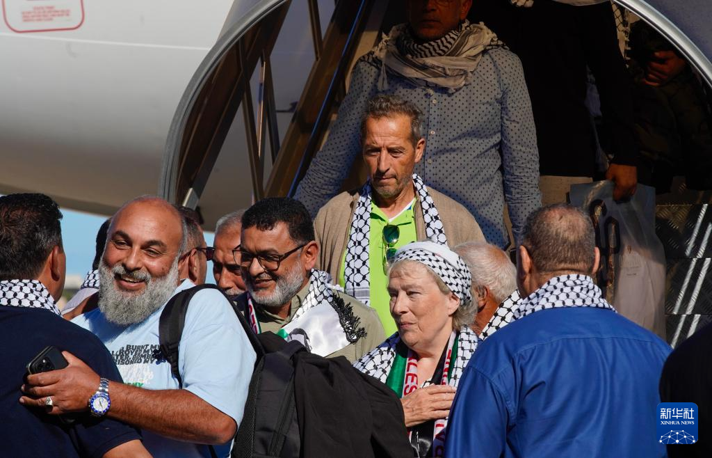 10月8日,在利比亞首都的黎波里米提加機場,人們迎接被以色列扣押后釋放的“全球堅韌船隊”利比亞船只成員。