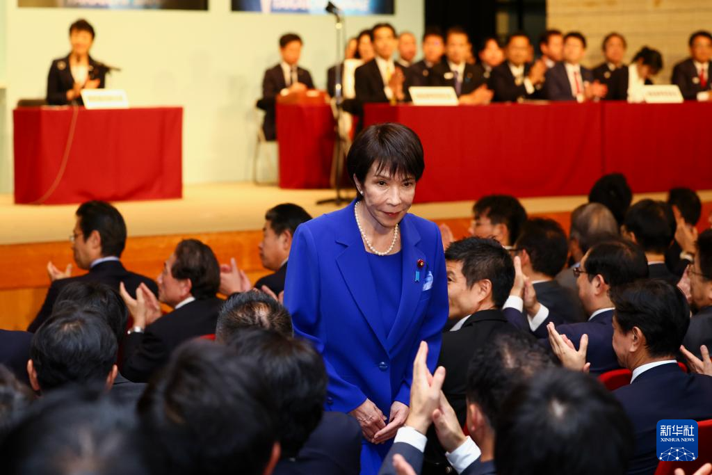 10月4日,在日本東京的自民黨總部,高市早苗(中)在自民黨總裁選舉中勝出后接受祝賀。